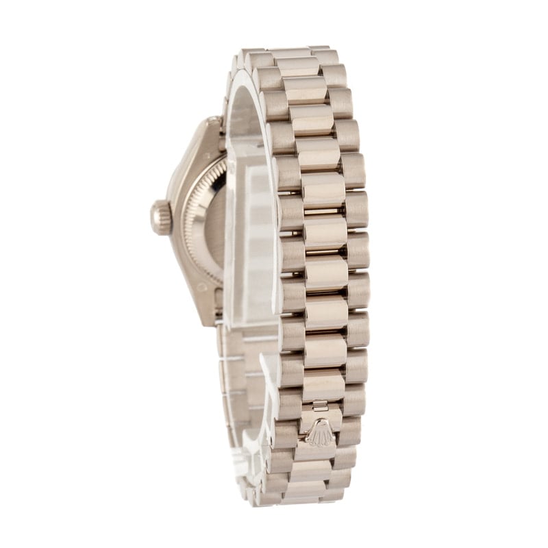 Pre-owned Rolex Datejust ref 179159 (2007 - 2008). What do you get when you combine the most exquisite white gold on the market with glittering diamonds and a shimmering black Mother-of-Pearl dial? A truly magnificent women's mechanical wristwatch. The Lady-Datejust has been a staple of the Rolex portfolio since the 1950s, combining the same self-winding technology and waterproof Oyster case as the men's range with a feminine size and weight. It's timeless, elegant, and singularly reliable - everything collectors are searching for in a solid luxury watch investment. This model is cased in lustrous white gold produced in-house and features a diamond-encrusted bezel and lugs and a black MOP dial adorned with white gold and diamond hour markers. Additionally, this model is a Rolex Presidential, wearing on the exclusive three-link President bracelet.
