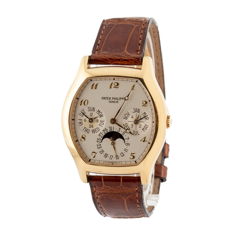 Patek Philippe came out with the reference 5040 in 1992 and it was in production until 2007. Patek offered this model in yellow gold, rose gold, white gold, and platinum. It is estimated that Patek made approximately 1800 pieces in yellow gold, like the example we have here. Patek made multiple different dial combinations for this model during its production and the watch we have here has a classic opaline-white dial with Breguet style numerals and hands. The 5040 is an automatic perpetual calendar with the same movement as the legendary reference 3940 with micro-rotor. We love the little details like the “sigma dial” and minute track around the edge of the dial. The The 5040 is distinguished by its tonneau style case; shaped watches by Patek are often overlooked and the 5040 is an example of that.