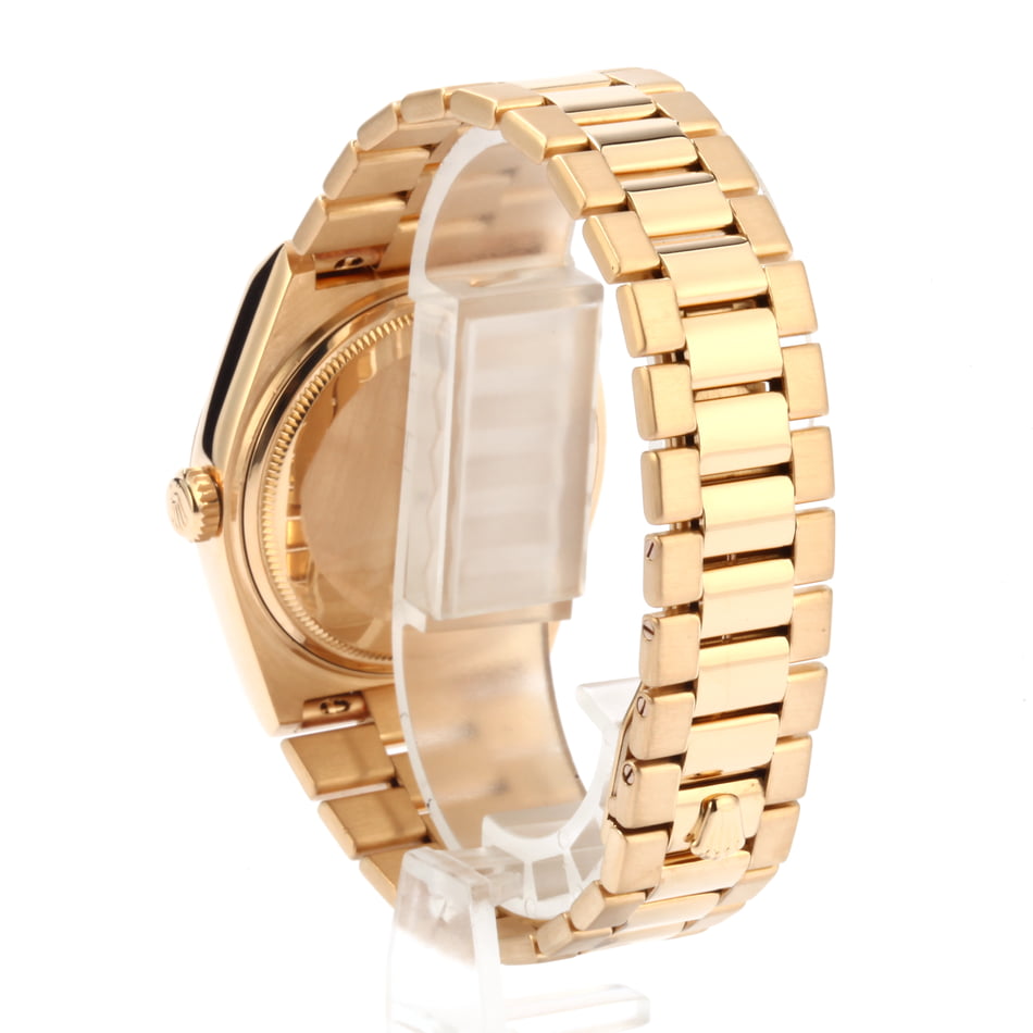 The Rolex 19018 is the OysterQuartz variation of the Day-Date that runs on a Quartz movement and showcases an integrated bracelet and angular case that are exclusive to the OysterQuartz line. Produced for a short time from the 1970s into the 1980s, the OysterQuartz line was Rolex's answer to an emerging trend among collectors for timepieces powered by Quartz movements. The trend didn't last for long, and the series was discontinued, making this particular preowned Rolex a widely sought-after collector's item by those in-the-know. In true Day-Date fashion, the case and bracelet are presented in gold, and the dial is topped with a jump date at 3 o'clock and the day spelled out in full at 12 o'clock.