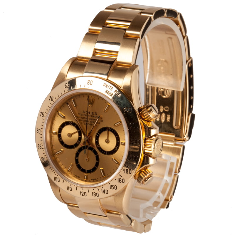 Pre-owned Rolex Daytona ref 16528 (1990) is the watch discerning collectors are after, not just because it is a coveted gold Rolex, but also because it has a fascinating history. Before Rolex developed and produced chronograph movements in-house, they outsourced automatic movements to Zenith and the "El Primero" movement. Rolex then modified that movement and labeled it the caliber 4030, the same movement powering this incredible piece of Rolex history. Many have since come to call the 5-digit Daytona equipped with the caliber 4030 the "Rolex Zenith." The gold iteration for sale here is a champagne dial Rolex with sleek black chronograph sub-dials, red text, and stopwatch functionality.