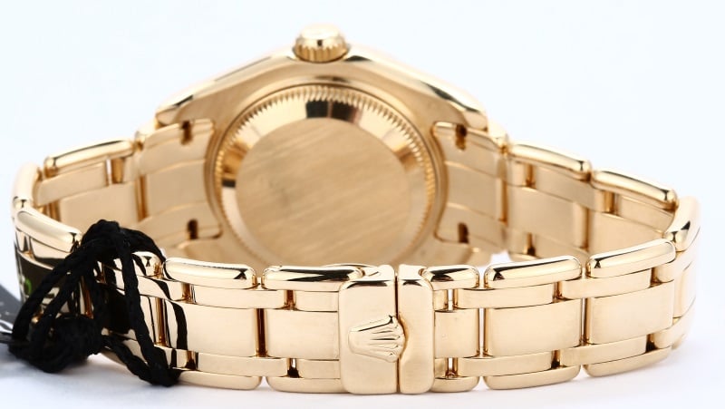 The gorgeous Rolex Pearlmaster Lady-Datejust will mesmerize you from the moment you put it on your wrist with a beautiful Mother-of-Pearl dial, 18 karat yellow gold construction, and a diamond bezel. The price of 18 karat yellow gold and diamonds are expected to rise, making this ladies dress watch a wise investment opportunity. The reference 69298 that is offered here today features a flattering fit with a 29mm Oyster case paired with a Rolex Pearlmaster bracelet. Its size and weight is ideal for most womens wrists and will look and feel like jewelry. A scratch-resistant sapphire crystal and a waterproof screw-down crown offer protection against everyday wear as well as depths of up to 330 feet, protecting the value of this timepiece for years to come.