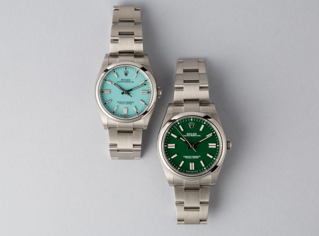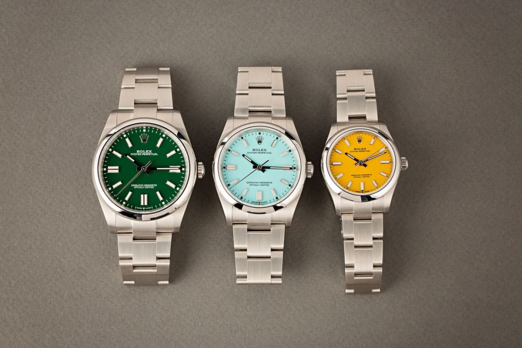 Variety of dial color is the Oyster Perpetual’s real superpower. There’s a dial for every taste, but every dial works well together. If you’re conservative, Black, Silver, and White are a chameleon you can wear with anything. These are masterclasses in Rolex finishing: almost monochromatic but with the tiniest of graining or sunburst pattern you notice only as the light changes.