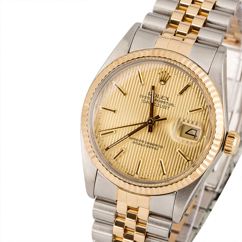 If you seek an earlier vintage Datejust, consider the ref. 16013 that is listed here today. Produced in the early 1980's, the 5-digit 16013 is equipped with a chronometer-rated calibre 3035 perpetual movement, complete with a Quickset function that allows the wearer to adjust the date display with a quick twist of the waterproof crown. The secondhand Rolex 16013 also features classic Datejust style via a 36mm Oyster case topped with a yellow gold fluted bezel and worn on a five-piece link Jubilee bracelet. A matching champagne tapestry dial tops the case and complements the two-tone finish nicely, creating a striking statement piece for almost any occasion.